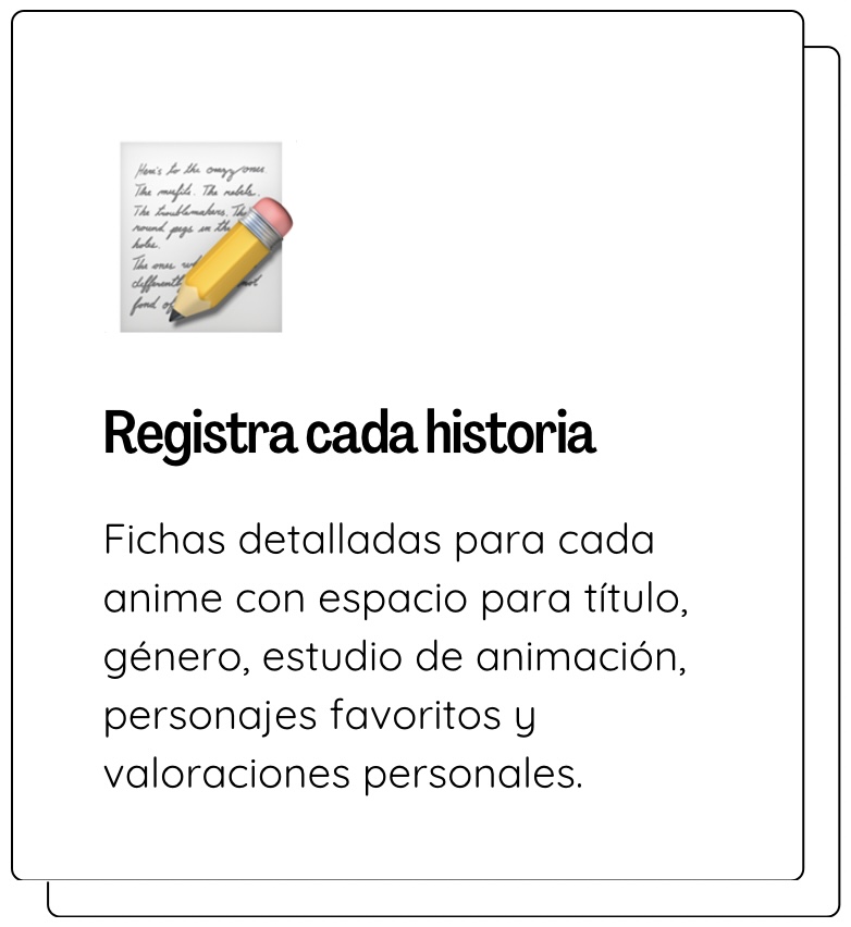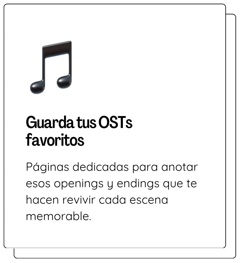 ❌ Libretas normales: No tienen estructura específica para animes. Terminas con notas desordenadas que nunca encuentras. ❌ Apps: Requieren internet, pueden desaparecer, y nunca se sienten tan personales como algo que DISEÑAS tú. ✅ Este diario: Tiene toda la estructura que necesitas (Fichas de ANIME, OSTs, Seiyuus) PERO también libertad para personalizarlo. Es lo mejor de ambos mundos. Además, es TUYO para siempre. Nadie puede quitártelo.